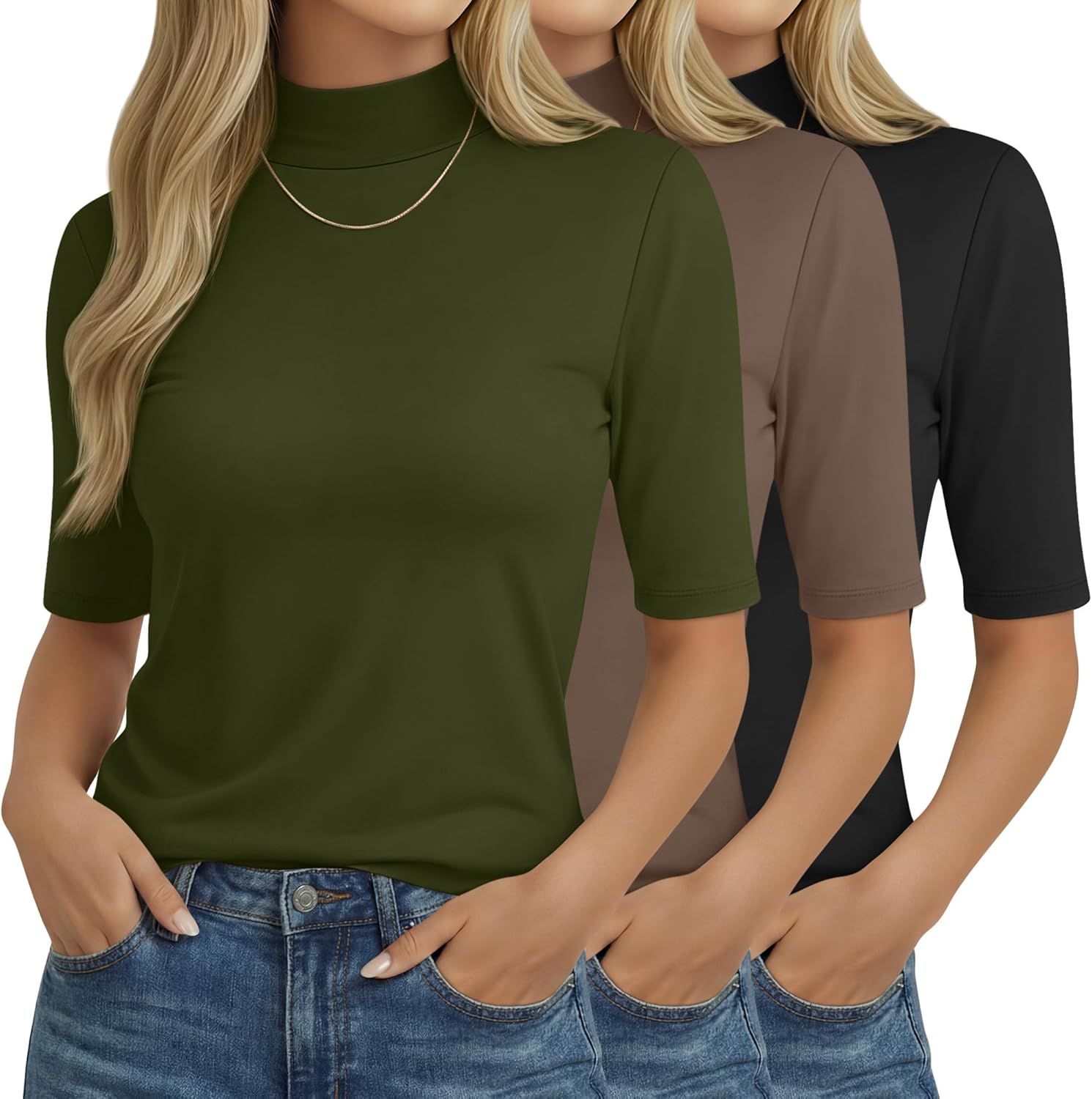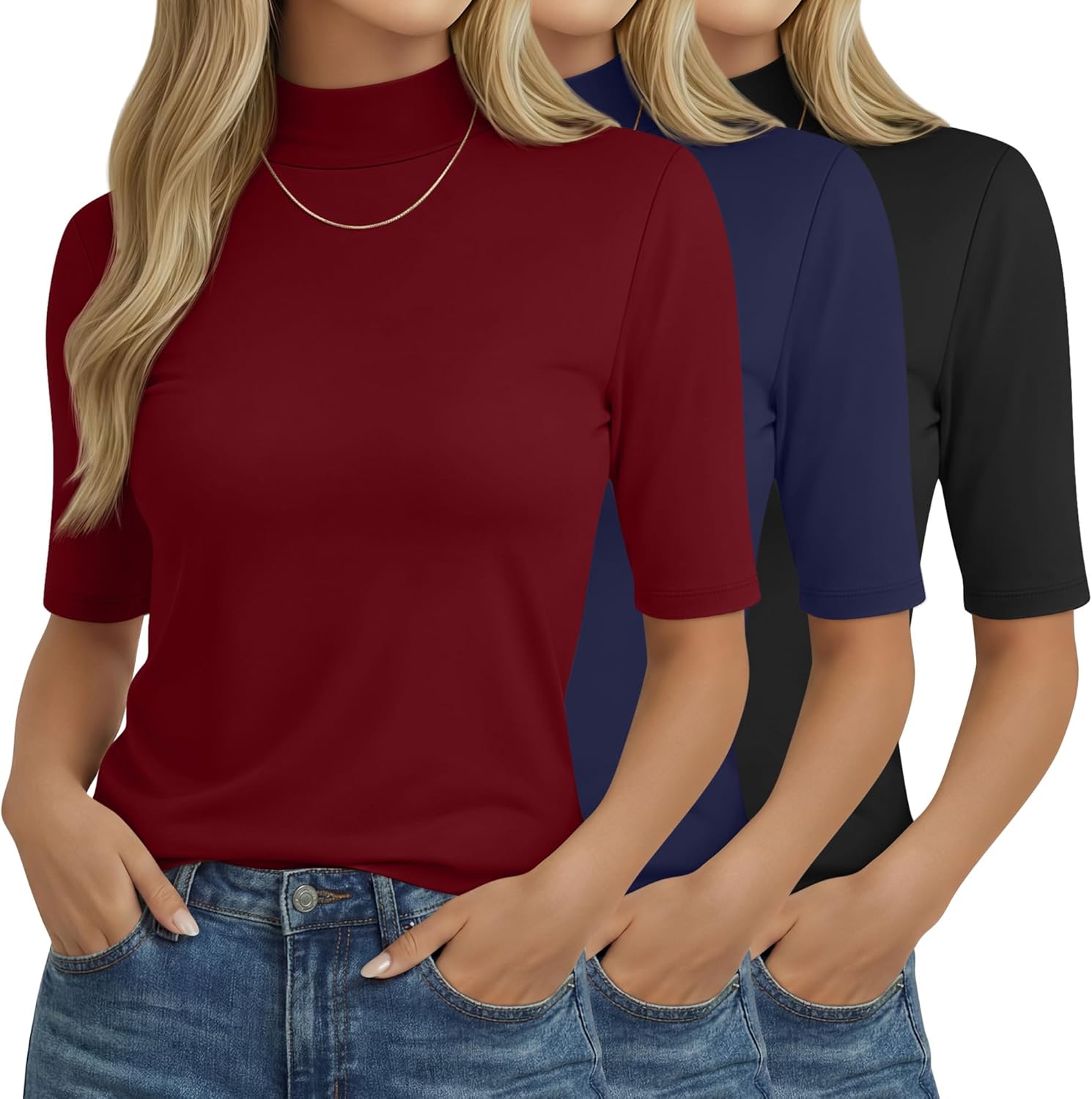 Features: Our 3 pack of short sleeve mock turtleneck shirts for women offers present versatility, thoughtfully packaged for treating yourself or as a birthday, holiday surprise to loved ones. These basic undershirts for women preserve their shape with simple care: machine wash gently or hand rinse cold, then air dry to maintain softness for long term Specifications: Material: 60% Polyester, 35% Rayon, 5% Spandex Package includes: 3 Pack women's half sleeve shirts Notes: Manual measurement, please allow slight errors on size. The color may exist a slight difference due to different screen displays