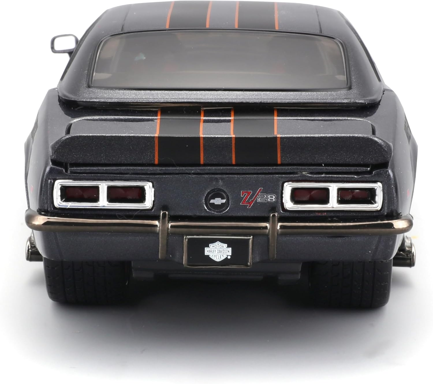This officially licensed 1:24 scale model by Maisto replicates the legendary 1968 Chevrolet Camaro Z/28 in a dark gray metallic finish accented with black and bold orange stripes, and bears the iconic Harley-Davidson “H-D Custom” branding. With die-cast metal construction, rubber-look tires, and full opening hood, doors and trunk, it’s a standout piece for collectors of muscle-cars and custom livery models.