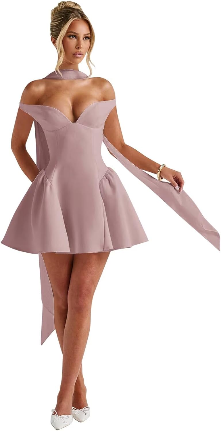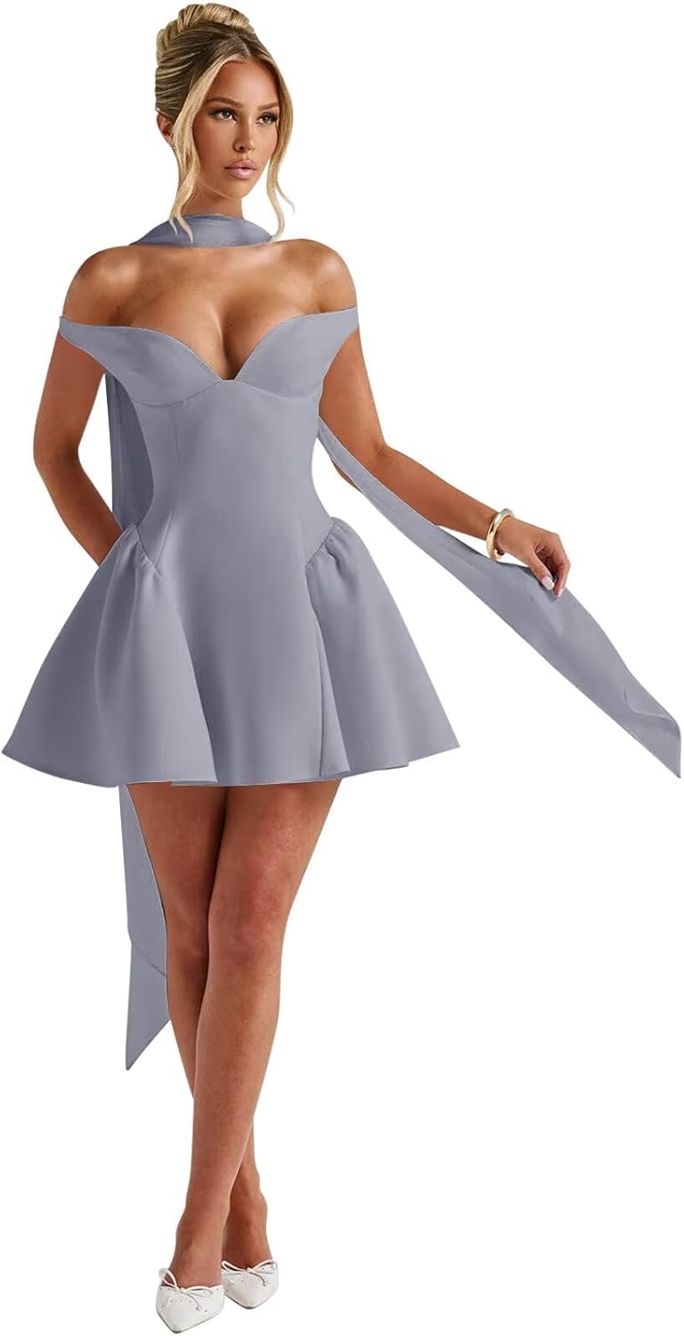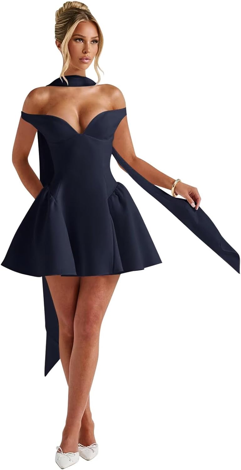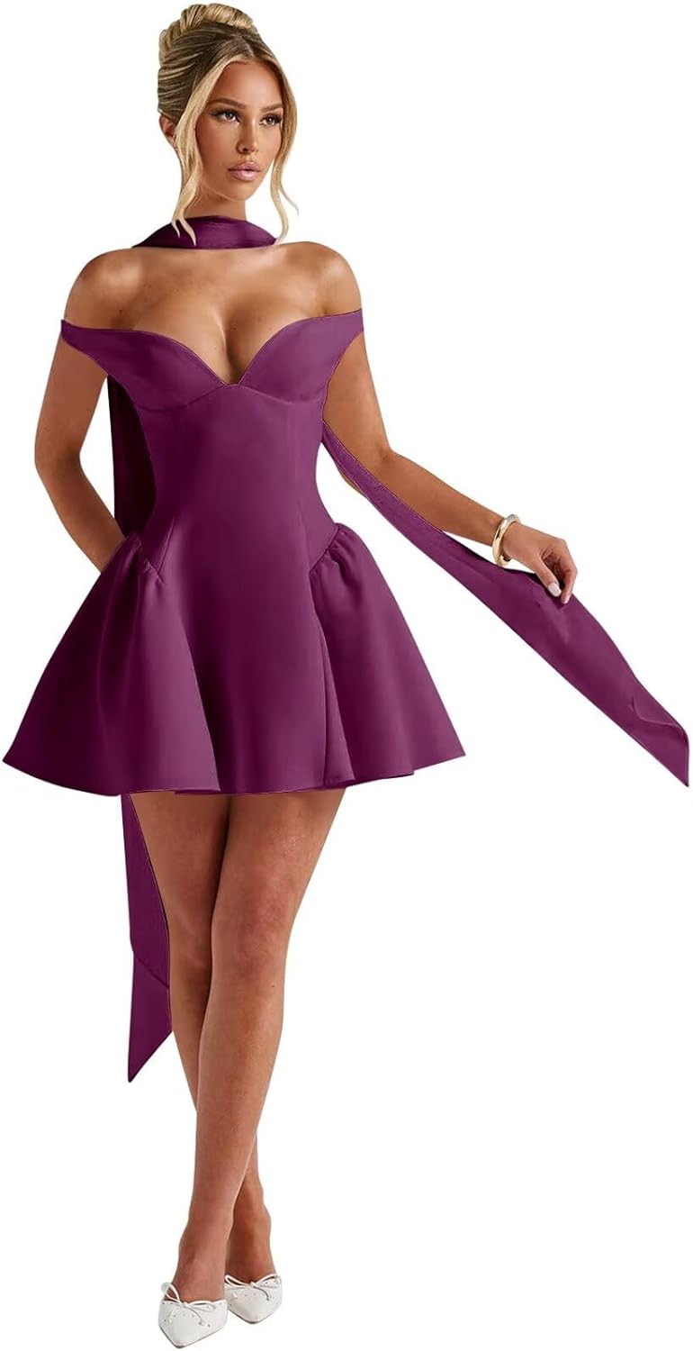 | Embellishment Feature | A Line, Mini, Off Shoulder, V Neck, with Scarf |